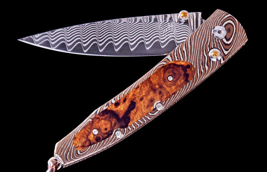 Edition of 100 PiecesTitanium pocket knife with koa wood and 'copper wave' damascus blade